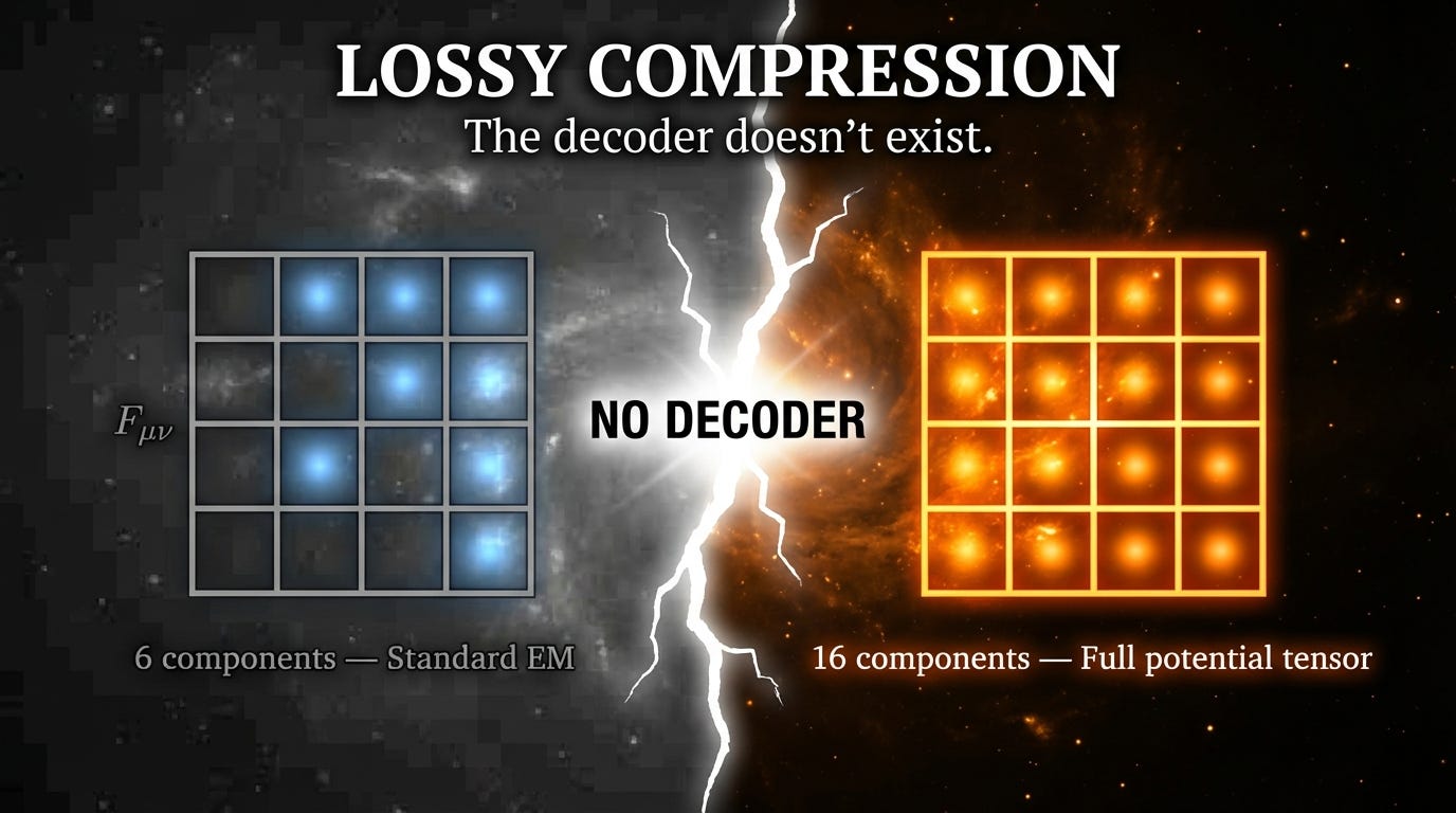 Similarly, the field representation F_μν is perfectly useful for transverse electrodynamics. But you cannot reconstruct the potentials from the fields. That’s what gauge freedom means: multiple originals map to the same compressed output. The decoder doesn’t exist.
