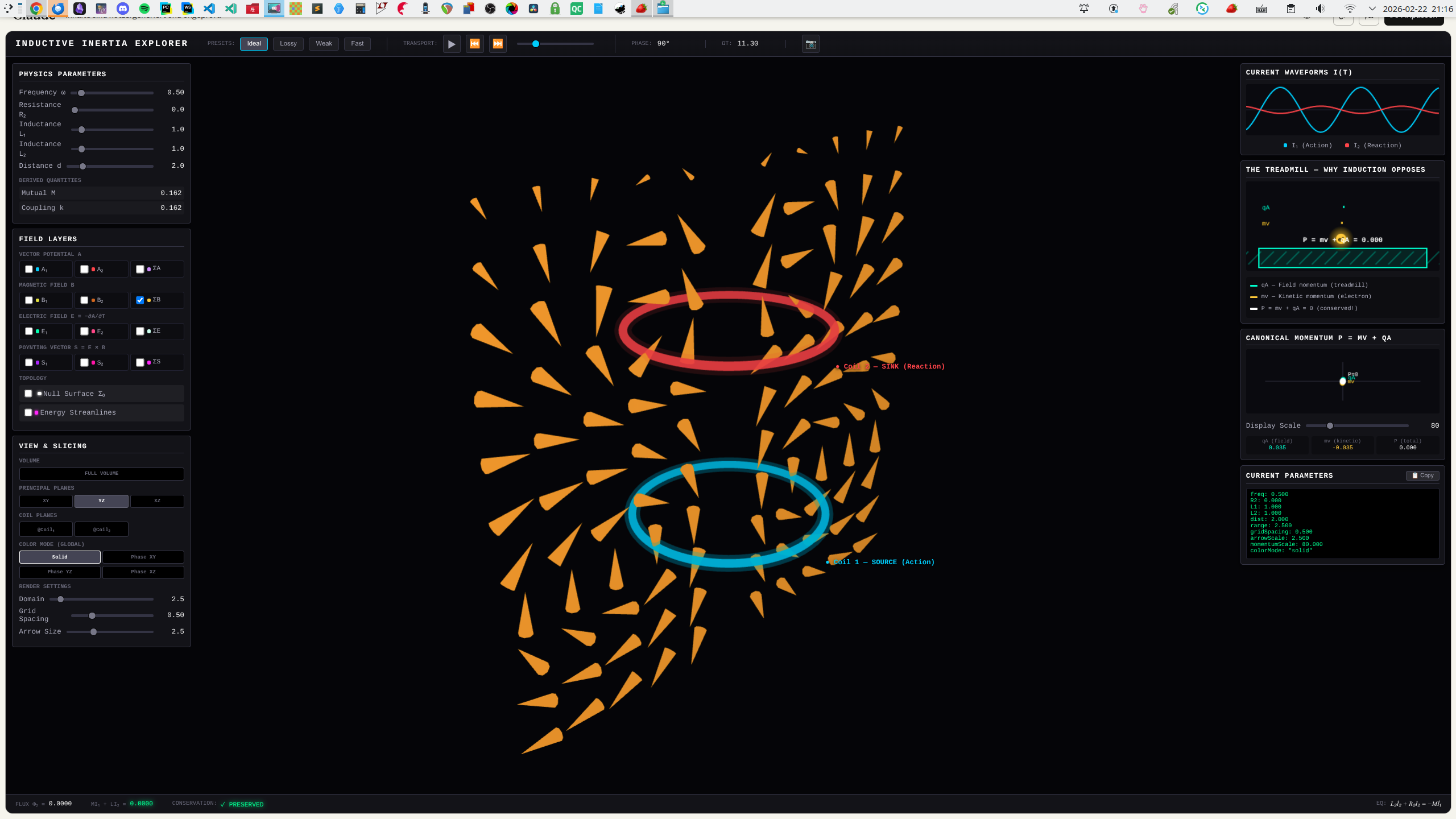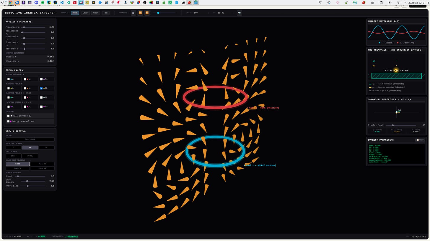 I vibe-coded this interactive simulator with Claude â ramp up a primary current and watch the canonical momentum constraint force the secondary current to oppose it in real time.