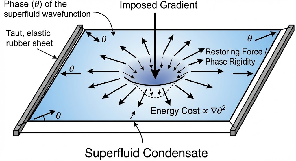 Phase rigidity. The condensate resists imposed phase gradients the way a taut rubber sheet resists deformation. Push it down somewhere, it pushes back everywhere.