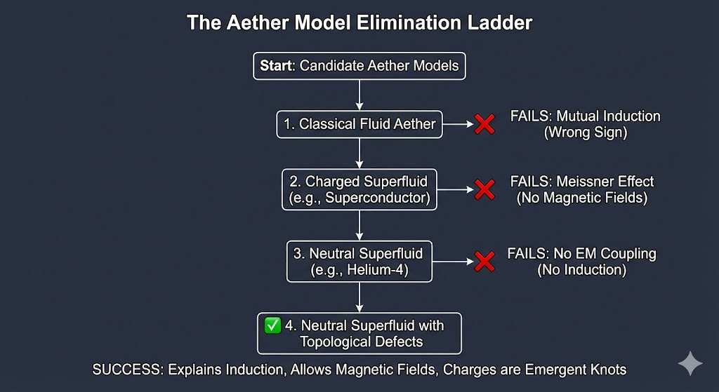 The elimination ladder. Classical fluid fails at mutual induction. Charged superfluid fails at the Meissner effect. Neutral superfluid fails at EM coupling. Only one candidate survives.