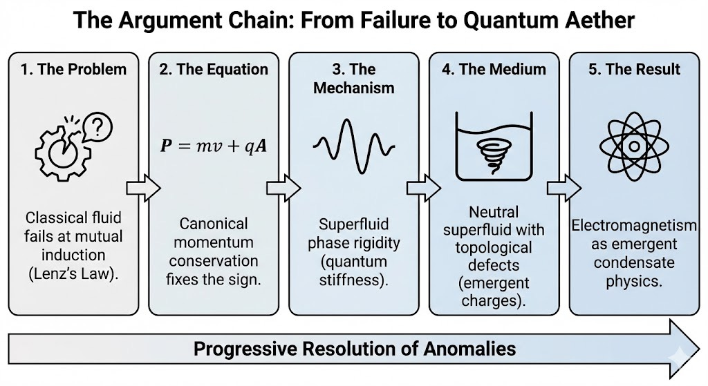 The classical fluid aether was never wrong. It was incomplete. It captured statics perfectly (Coulomb, Bernoulli, Aharonov-Bohm) because in equilibrium a superfluidâs density and velocity fields behave like a classical fluidâs. The model only breaks when dynamics enter, when dA/dt demands opposition that classical fluids canât provide.