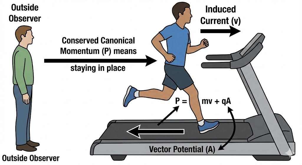 And the canonical momentum equation? P = mv + qA being conserved is phase rigidity, translated from condensate language into particle language. The equation is the shadow on the wall. The phase dynamics are the thing casting it.