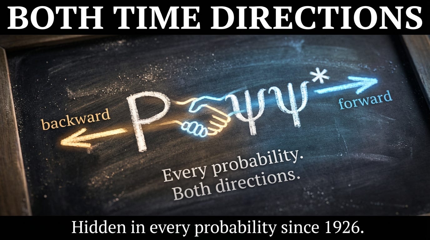 Here’s what the textbooks gloss over. The formula has two factors. ψ, the wave function, propagates forward in time. ψ*, the complex conjugate, propagates backward. Wigner proved this in the 1930s: the time-reversal operator in quantum mechanics IS complex conjugation. When you write ψ*, you’re writing a wave that runs backward through time.