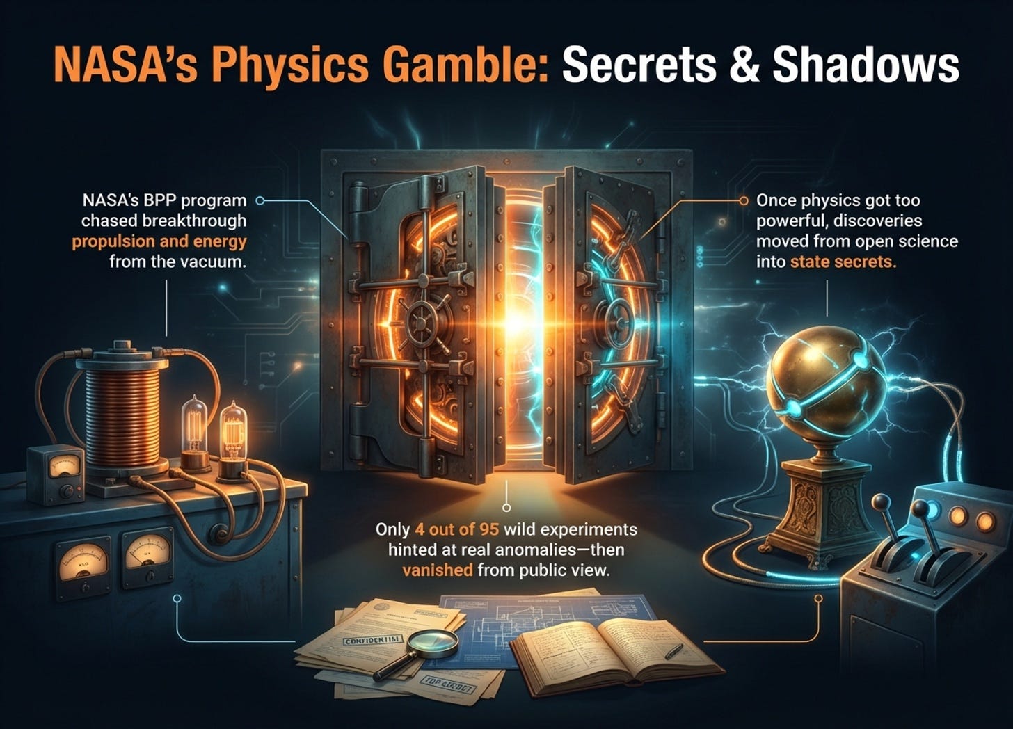 In the late 1990s, NASA’s Breakthrough Propulsion Physics (BPP) program dared to chase the impossible: propulsion without propellant, energy from the vacuum, and even faster-than-light travel. These weren’t sci-fi dreams. They were concrete research threads with real budgets, real experiments, and real institutional anxiety.